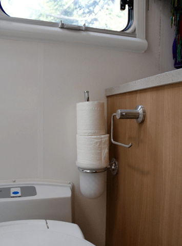 To get the most use out of it, you can also utilize this holder designed for a toilet brush as a tissue roll holder by using its handle. This versatile tool is great for saving space. The best part is that the handle will stop your rolls from unraveling, which is often a problem in a caravan.