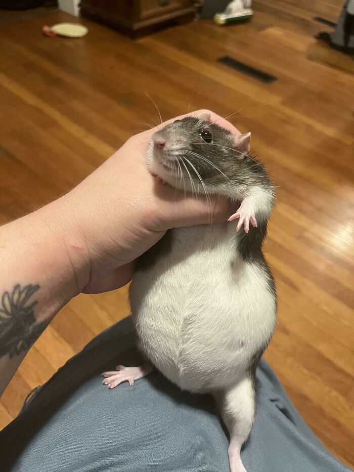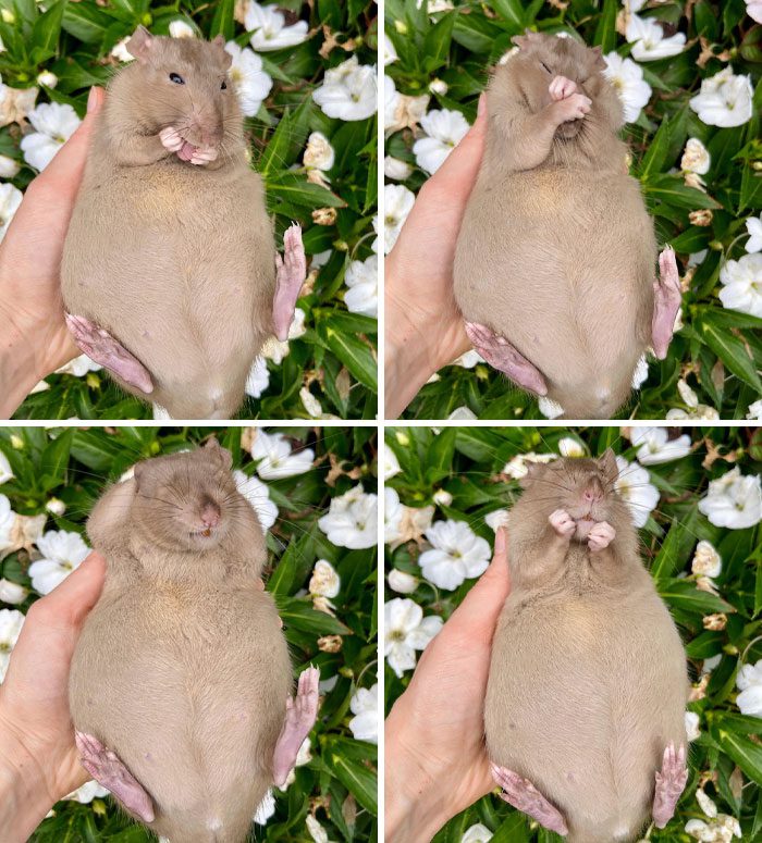 In this case, the rat needed a hand showing off her baby bump for the camera, and her owner was more than happy to help! Now, we’re curious—how many babies does she have in there, and when is her due date? It looks like she could use a rest.